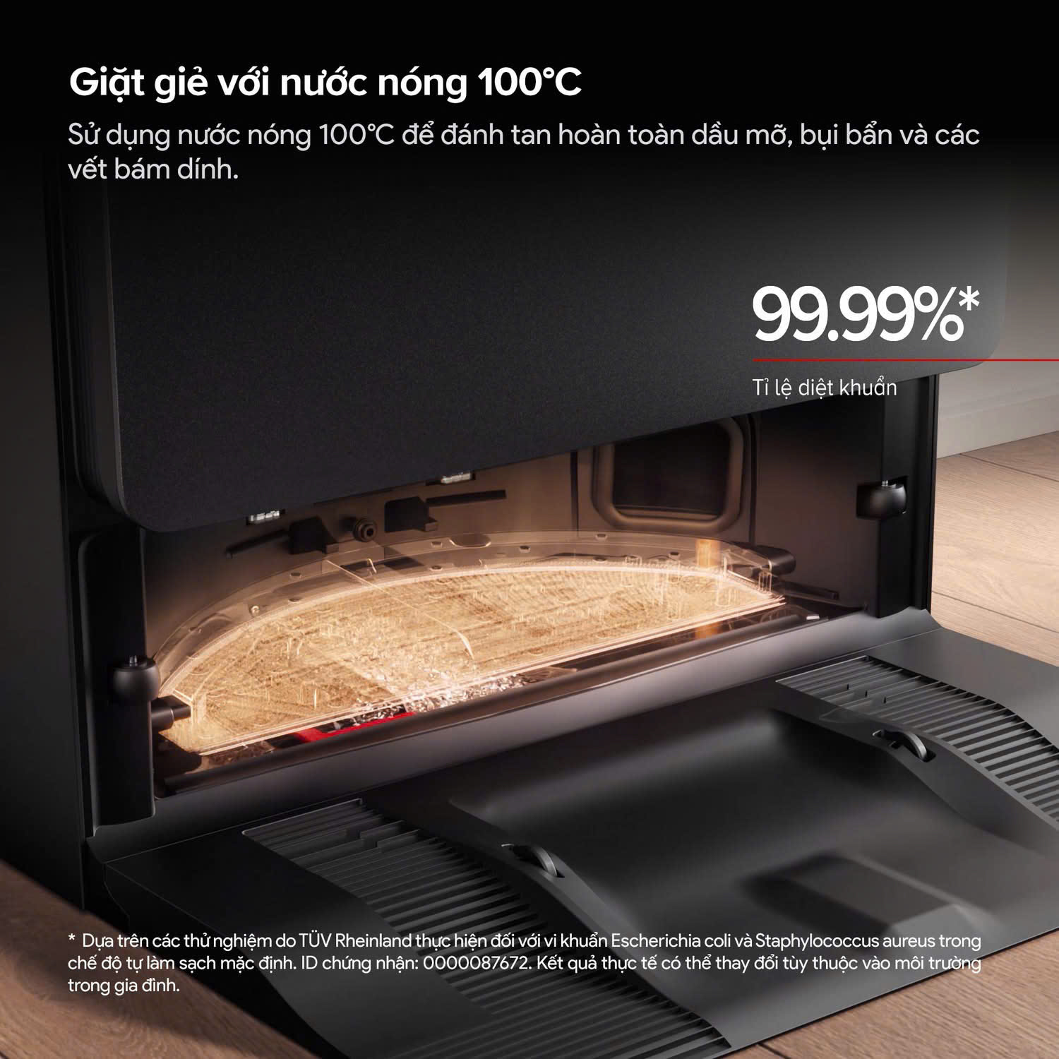 Giẻ lau hình chữ D độc quyền có khả năng "duỗi" ra hai bên khi tiếp cận mép tường, góc nhà hoặc chân bàn ghế. Điều này đảm bảo làm sạch sát cạnh lên đến 100%, khắc phục nhược điểm của các robot lau nhà thông thường chỉ tiếp cận được 80-90% diện tích cạnh tường.