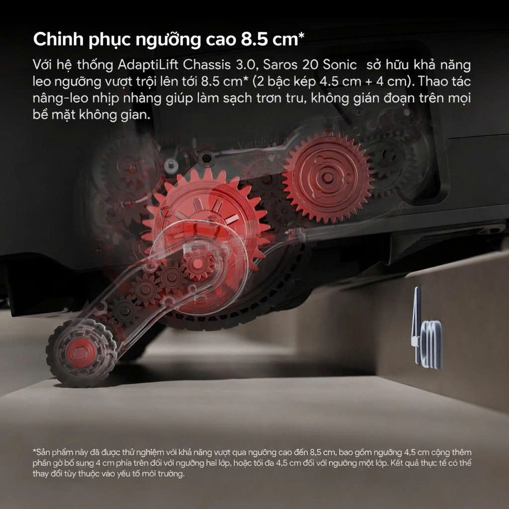 Hệ thống khung nâng thích ứng AdaptiLift Chassis 3.0 là bước tiến lớn, cho phép Saros 20 Sonic vượt ngưỡng cửa cao đến 4.5 cm (đơn tầng) hoặc 4.5 + 4 cm (đôi tầng). Cấu trúc bao gồm bánh chính, bánh phụ và cánh tay leo, tự động điều chỉnh khi gặp chướng ngại vật.