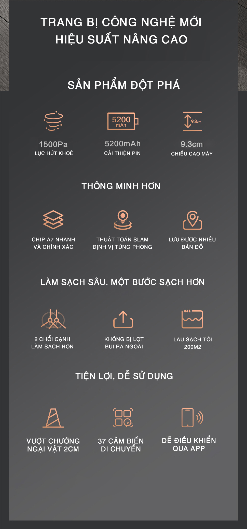 Pin khủng: Robot sử dụng pin cực khủng, Lithium Ion 5200mAh. Dòng pin này cho phép robot làm việc đến 200 phút trong khoảng diện tích 200m2/phiên làm việc. Điều mà khó có loại robot hút bụi nào có thể cạnh tranh với T5 Max.