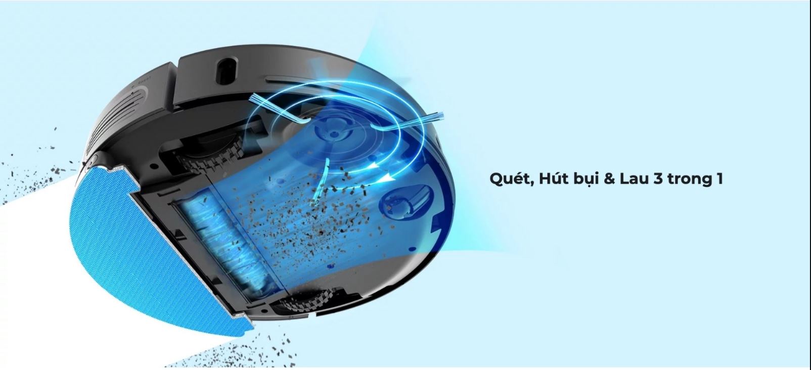 Thiết kế kết hợp 3 chế độ quét nhà, hút bụi, lau nhà giúp tiết kiệm thời gian làm việc và năng lượng hoặc người dùng cũng có thể tùy chỉnh chế độ làm việc của robot dựa vào nhu cầu sử dụng của từng gia đình.