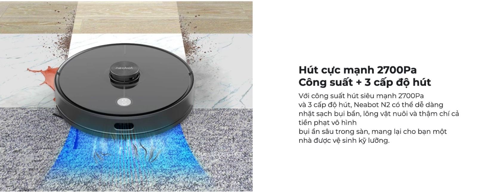 Neabot N2 Lite được thiết kế lực hút lên đến 2700Pa với 3 cấp độ hút khác nhau giúp robot dễ dàng làm sạch các loại bụi bẩn, lông thú và các loại bụi mịn trong không khí giúp không khí trong lành hơn.