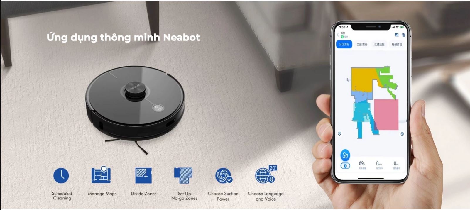 Việc kết nối với ứng dụng thông minh Neabot với hỗ trợ tiếng Việt giúp người dùng dễ dàng sử dụng và điều khiển, tùy chỉnh robot hơn trong quá trình làm việc.