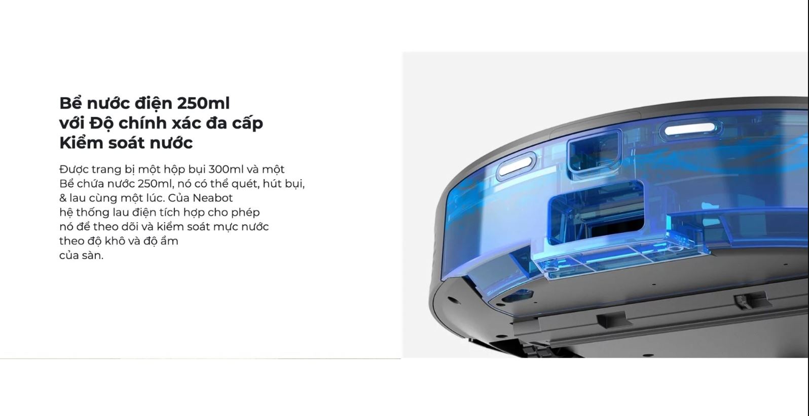 Hộp nước được điều chỉnh bằng điện thông minh. Kết hợp hút và lau mặt sàn 250 m2 cho một lần làm việc. Rẻ lau luôn được cung cấp nước và làm ẩm ở mức tốt nhất. Với dung tích lên đến 250ml.
