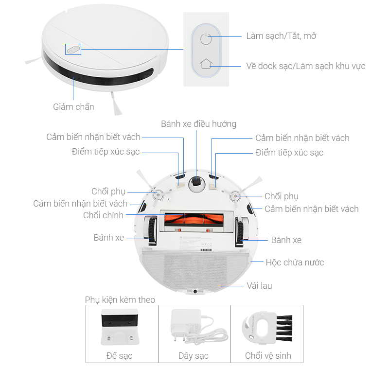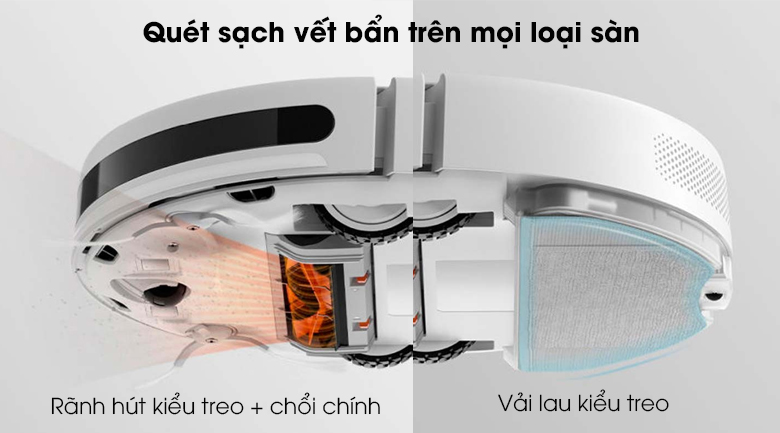 Máy có chổi chính loại bỏ các vết bẩn cứng đầu, làm sạch rãnh thấp hiệu quả. Thiết kế rãnh hút kiểu treo kích thước lớn vệ sinh triệt để mọi bề mặt. Vải lau tiết diện rộng cho robot lau chùi nhà cửa tiện lợi, nhanh chóng.