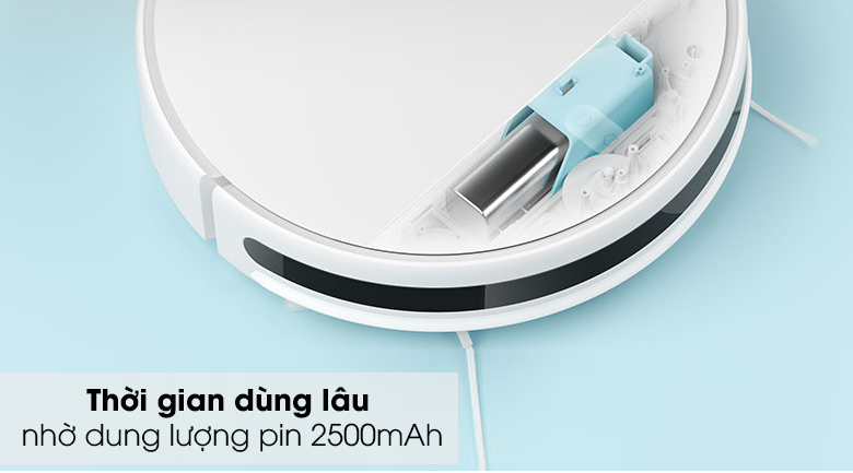 Pin dung lượng đến 2500mAh làm việc liên tục được khoảng 90 phút, khi sắp hết pin, máy tự quay về đế sạc