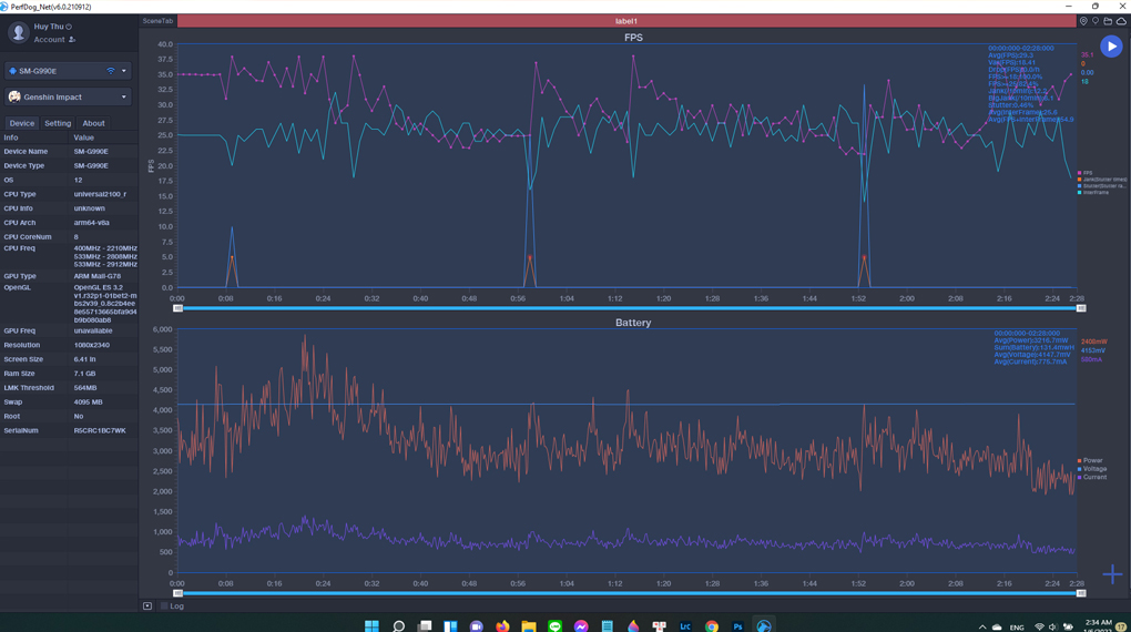 Kiểm tra cấu hình với tựa game Ghenshin Impact, game đặc biệt thử nghiệm cho các smartphone cấu hình cao, S21 FE chơi tốt ở đồ họa trung bình 30 FPS, có thể mở 60 FPS nhưng tình trạng drop FPS sẽ diễn ra liên tục.