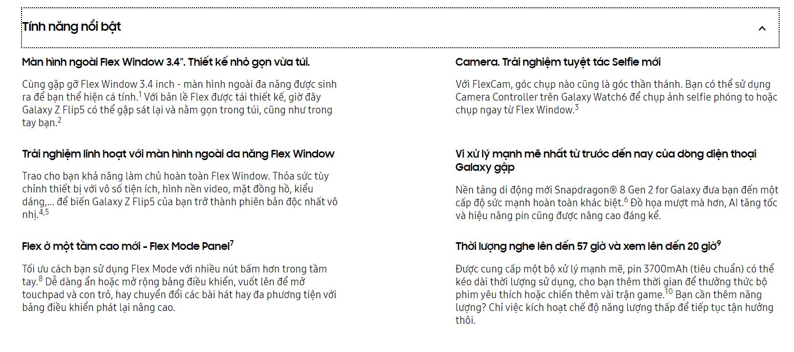 Điểm đáng chú ý đầu tiên trên dòng sản phẩm Galaxy Z Flip5 chính là trang bị bộ nhớ trong với 3 phiên bản bộ nhớ khác nhau, bao gồm: 128GB, 256GB và 512GB, tương tự như thế hệ tiền nhiệm.