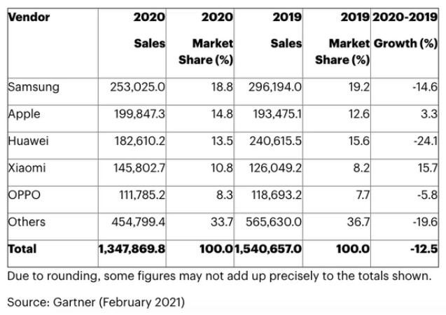 Tuy nhiên đó là số liệu của riêng quý 4. Nếu tính cả năm 2020, Samsung vẫn là đơn vị dẫn đầu thị trường điện thoại thông minh với tổng doanh số bán ra 253 triệu chiếc điện thoại, chiếm 18,8% thị phần. Con số tương tự của Apple là gần 200 triệu chiếc, chiếm 14,8% thị phần. Các vị trí tiếp theo là Huawei, Xiaomi và Oppo.