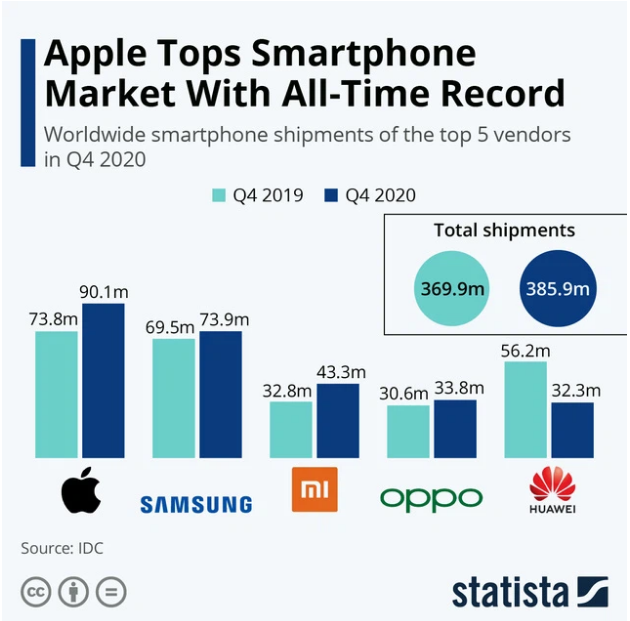 Lần đầu tiên kể từ năm 2016, Apple đã chính thức vượt Samsung để trở thành nhà sản xuất điện thoại thông minh lớn nhất thế giới nhờ vào kết quả kinh doanh vượt mong đợi trong quý 4 của năm 2020.