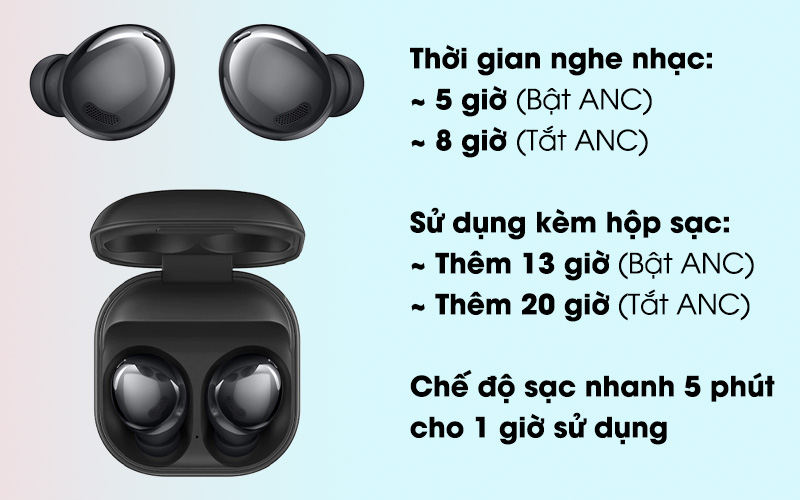 Tai nghe sẽ cho bạn trải nghiệm liên tục với những cuộc gọi hay những giờ nghe nhạc không gián đoạn với thời lượng dài đến hơn 8 giờ và còn lâu dài hơn khi có hộp sạc. Bạn sẽ có tổng cộng 18 giờ trải nghiệm ấn tượng khi bật chống ồn với 5 giờ nghe nhạc và thêm 13 giờ khi sử dụng hộp sạc. Đồng thời, khi tắt chống ồn thì bạn có tổng cộng 28 giờ trải nghiệm, nghe trong 8 giờ và thêm 20 giờ nữa khi sử dụng với hộp sạc.