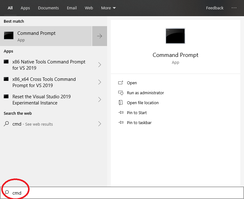Bước 1. Bạn gõ CMD vào khung Search ( Góc dưới cùng bên trái - hình Kính lúp ). Chọn Command Prompt.