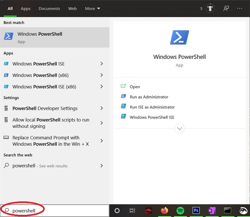 Bước 1. Bạn gõ PowerShell vào khung Search ( Bên trái dưới cùng trên màn hình của bạn - hình Kính lúp). Chọn Windows PowerShell.