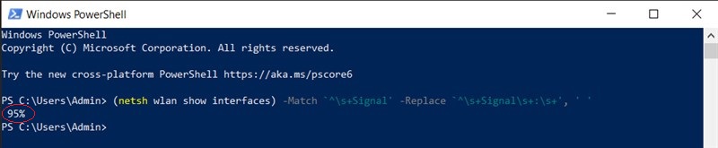 Bước 2. Bạn dán (netsh wlan show interfaces) -Match ‘^\s+Signal’ -Replace ‘^\s+Signal\s+:\s+’, ’ ’ vào, nhấn Enter. Tức thì, độ mạnh tín hiệu Wifi của bạn sẽ hiện lên.