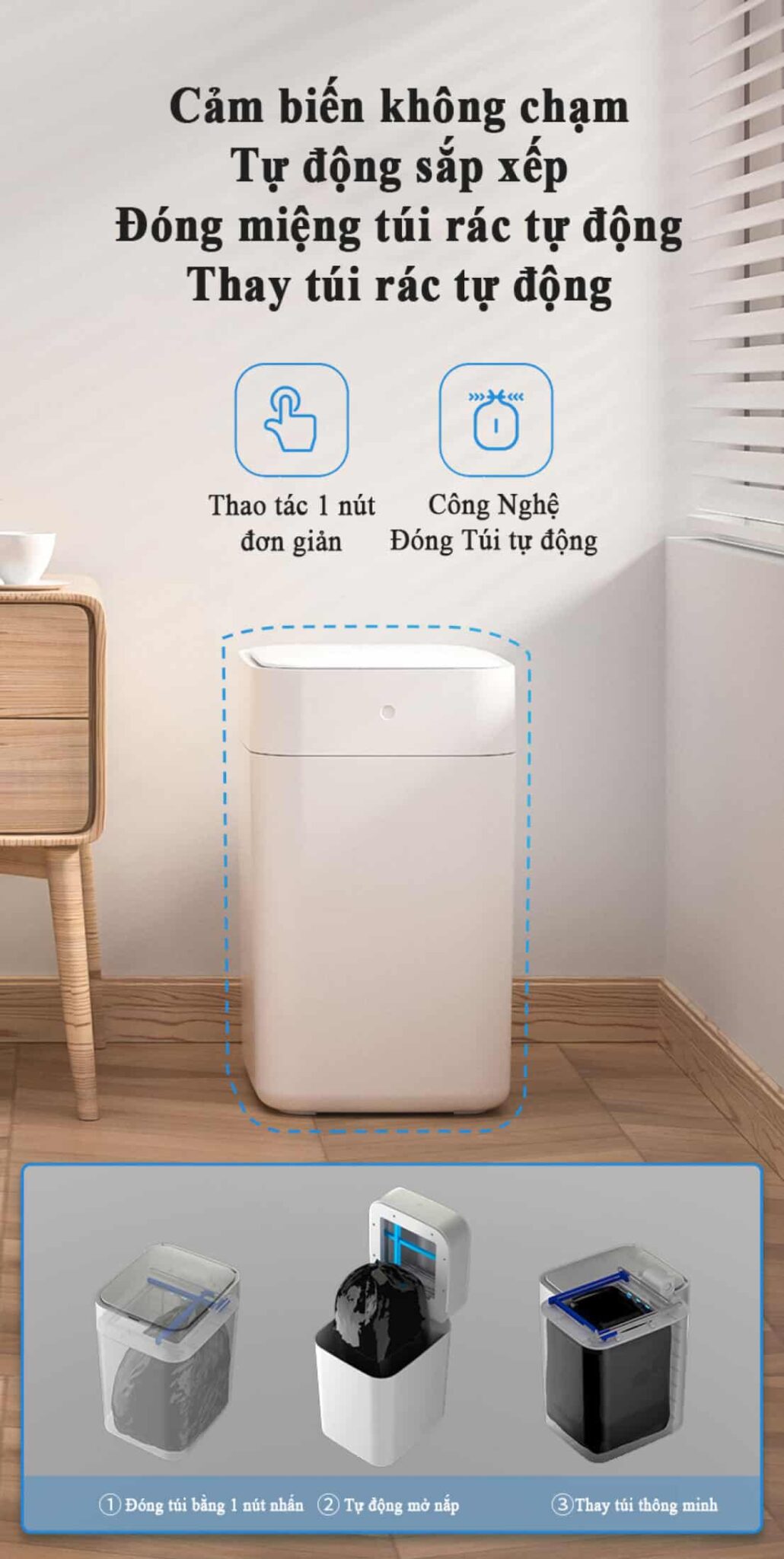 Chỉ với một thao tác bấm nút nhỏ, thùng rác thông minh TOWNEW T1S sẽ tự động thu gom túi rác cho bạn. Sau khi bạn bấm nút, thùng rác tự mở thông minh này sẽ thao tác đóng miệng túi nilon rác lại. Sẽ không còn cảnh bạn dùng tay để kéo thùng rác ra và đem đi đổ, rất phiền phức mà lại còn bẩn tay. Giờ đây, bạn chỉ cần cầm phần túi nilon đã được túm gọn miệng lại và đem đi vứt. Sau đó, máy sẽ tự động cho một túi rác mới vào thùng lại cho các bạn. Việc đổ rác giờ đây vừa nhẹ nhàng mà lại còn rất sạch sẽ khi sử dụng Xiaomi Townew T1S.