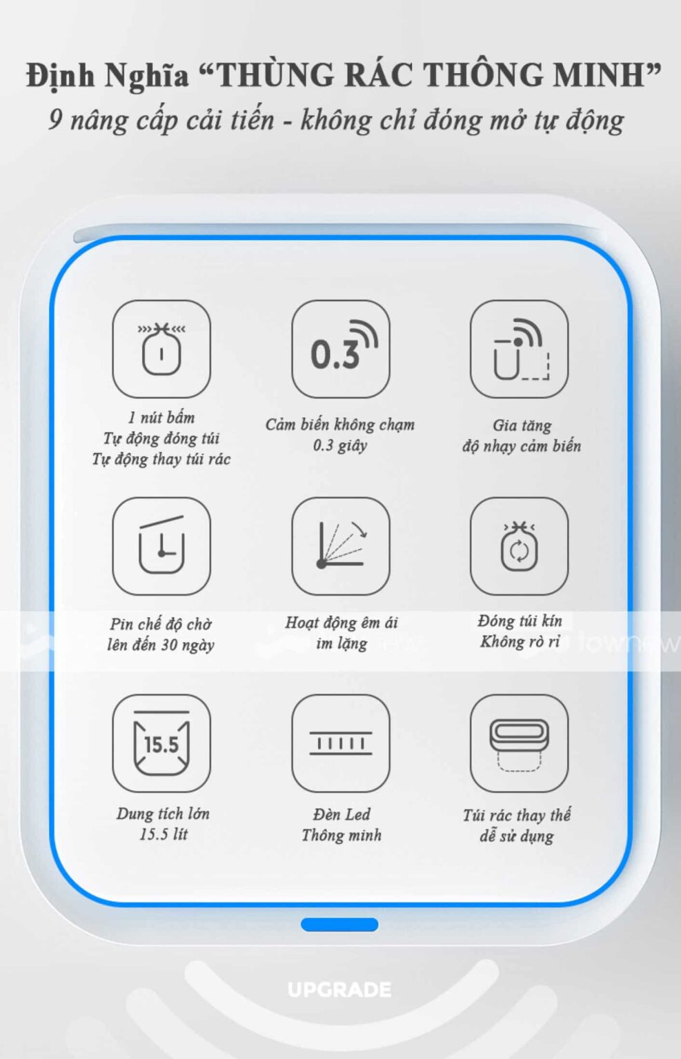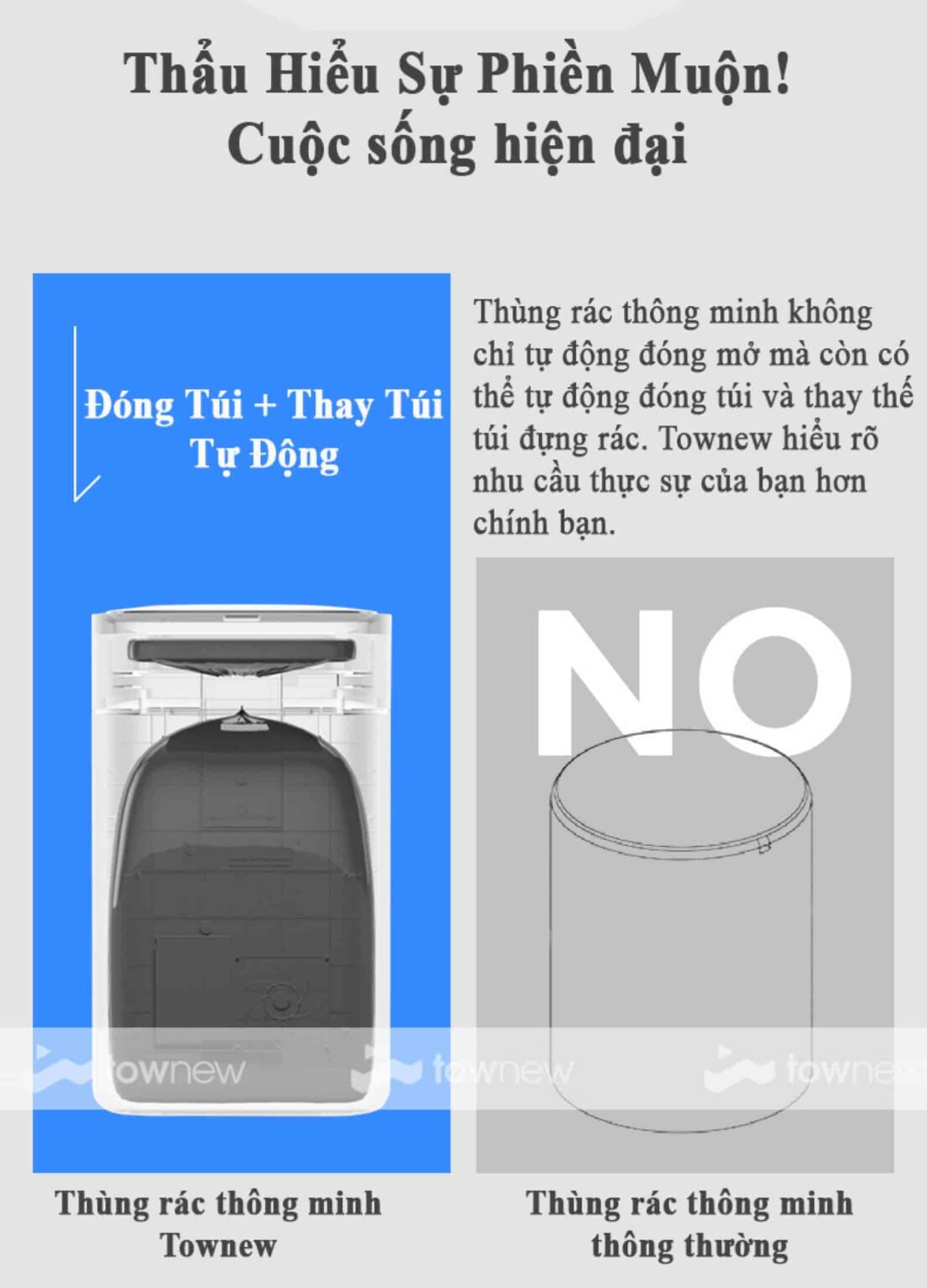 | Bộ sản phẩm bao gồm | Thùng rác thông minh, dây sạc, khay rác chuyên dụng TOWNEW, sách hướng dẫn sử dụng |