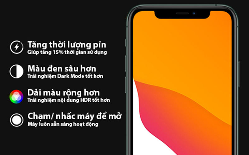Đặc biệt, Super Retina XDR hoạt động tiết kiệm pin hơn 15%, hỗ trợ chế độ Dark Mode tốt hơn và khả năng chạm, nhấc máy để mở màn hình vô cùng tiện lợi.