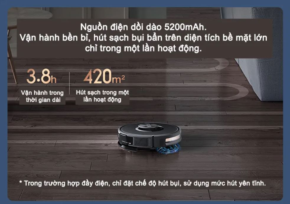 Máy hút bụi thông minh Xiaomi Viomi Alpha 2 Pro có thể chạy được 420m² nhờ pin mạnh lên tới 5200mah. Bình chứa nước với áp suất không đổi 320ml và có thiết kế để điều chỉnh lượng nước.