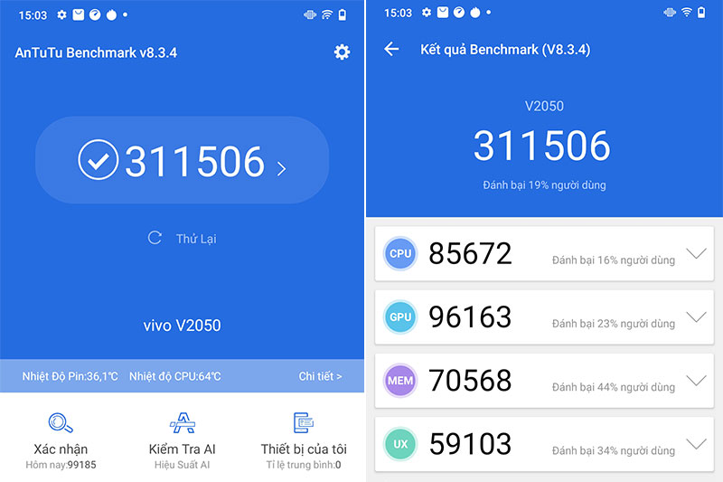 Khi được kiểm tra qua phầm mềm đo hiệu năng Antutu, Vivo V21 5G được khoảng 310.0000 điểm một con số khá ấn tượng. Với hiệu năng cao như vậy máy hoàn toàn đáp ứng tốt nhu cầu từ người dùng với nhiều tác vụ nặng, thoải mái trải nghiệm.