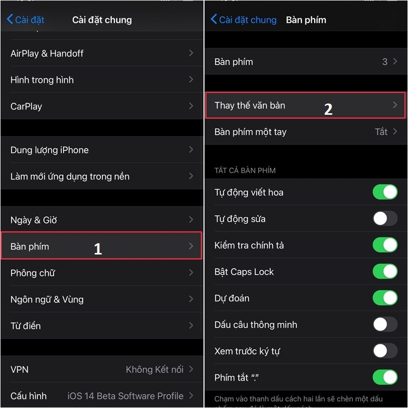 Bước 1: Vào mục Cài đặt chung > Bàn phím > Văn bản thay thế.
