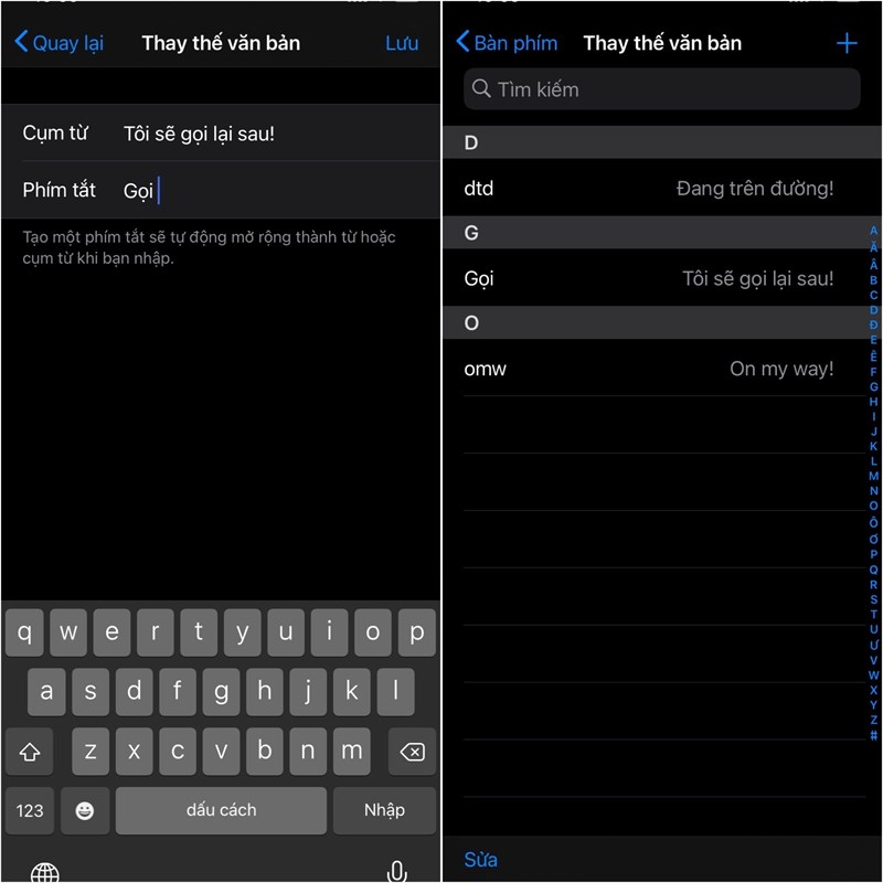 Bước 2: Trong mục Văn bản thay thế > bạn ấn vào biểu tượng dấu cộng ở góc phải để thêm cụm từ thay thế vào > Nhập đoạn văn bản mà bạn muốn > và thêm phím từ tắt thay thế vào Shortcut > Save.