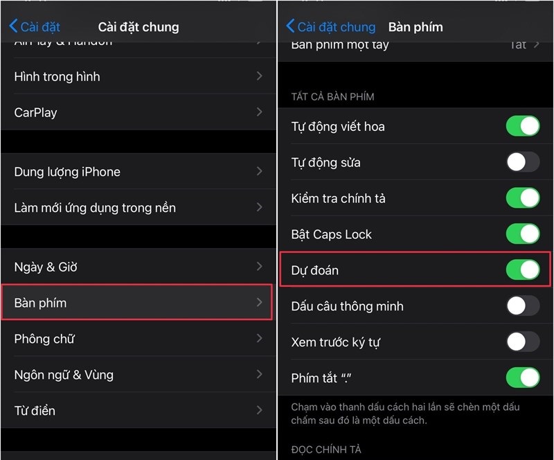 Vào mục Cài đặt chung > Bàn phím > là bạn có thể tùy chỉnh bật/tắt tính năng này.