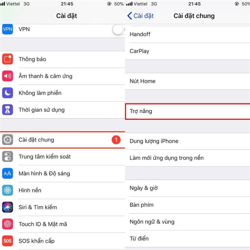 Vào Cài đặt > Cài đặt chung > Trợ năng