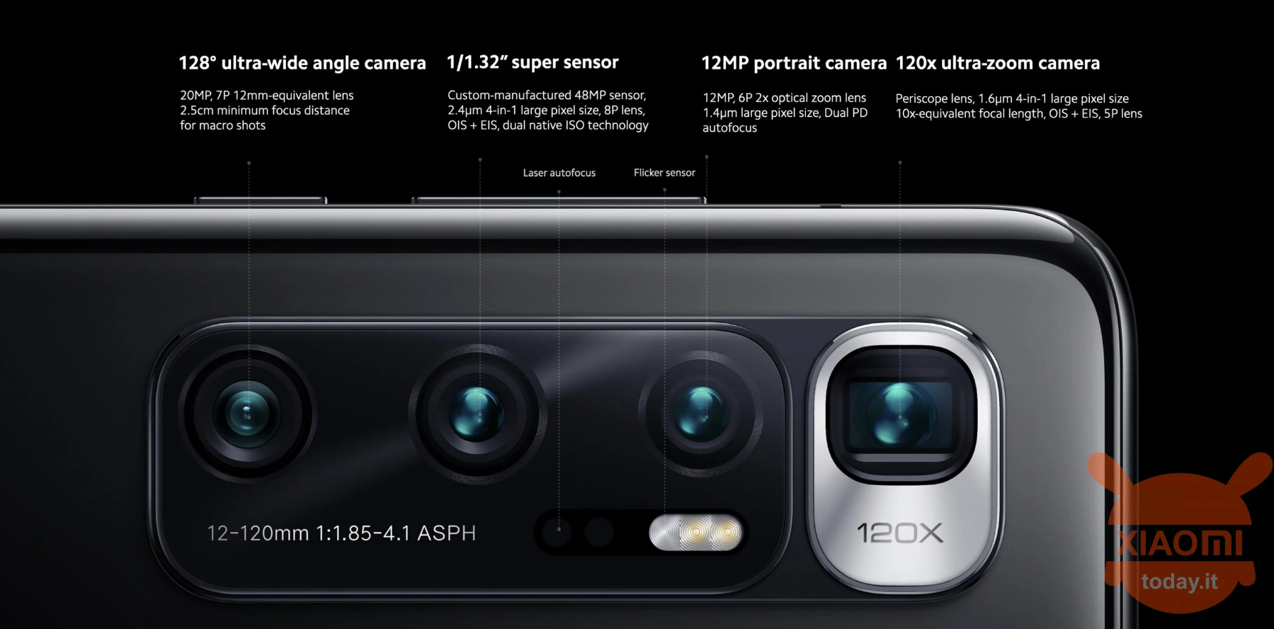 Di chuyển đến mặt lưng, Mi 10 Ultra mang trên mình hệ thống 4 camera xếp theo chiều dọc và đặt ở góc phía trên cùng bên trái. Cụm camera sau bao gồm cảm biến chính 48MP f/1.85, camera góc siêu rộng 20MP, camera tele tiềm vọng 48MP với khả năng zoom quang học 10x và zoom lai 120x, cuối cùng là cảm biến chiều sâu 12MP để chụp ảnh chân dung.