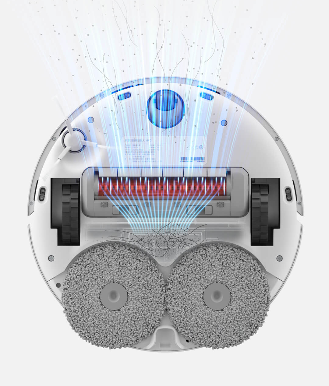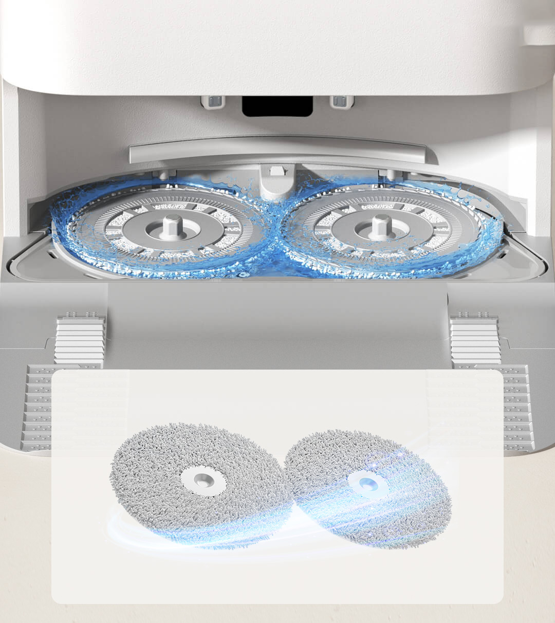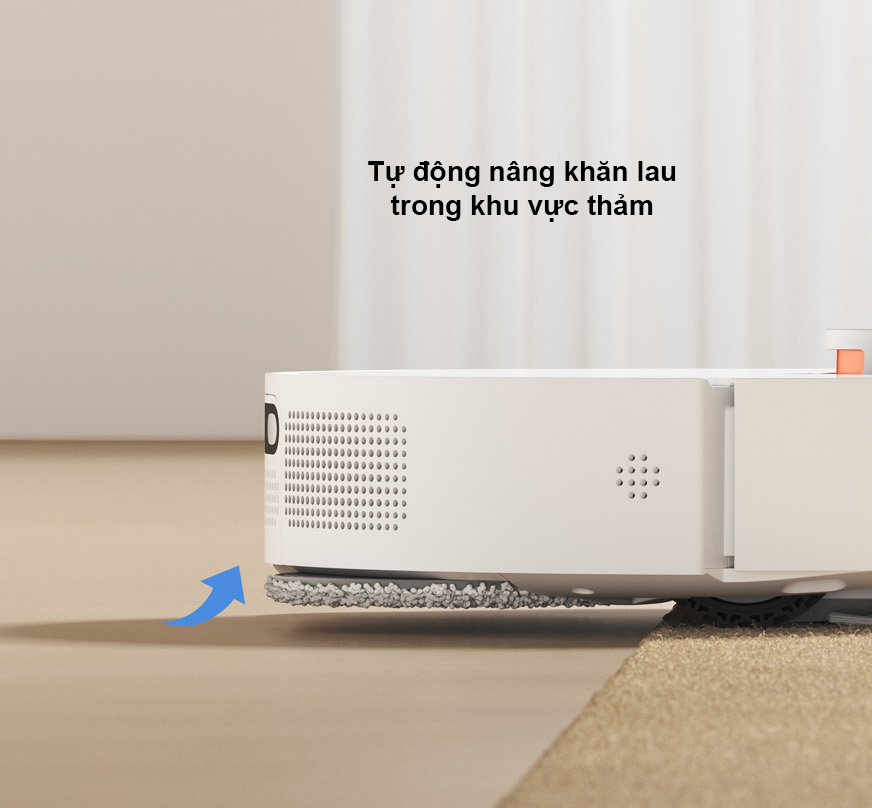 Robot mô phỏng thao tác lau xoắn thủ công, với khăn lau tròn xoay 180 vòng/phút, loại bỏ nhanh chóng các vết bẩn cứng đầu. Sản phẩm hỗ trợ 4 chế độ làm việc như: chỉ quét, chỉ lau, quét và lau, hoặc lau sàn kỹ lưỡng. Đặc biệt, khi phát hiện thảm, robot sẽ tự động nâng khăn lau và tăng lực hút để làm sạch hiệu quả mà không làm ướt thảm.