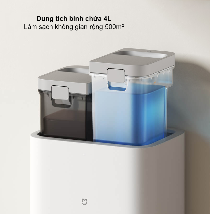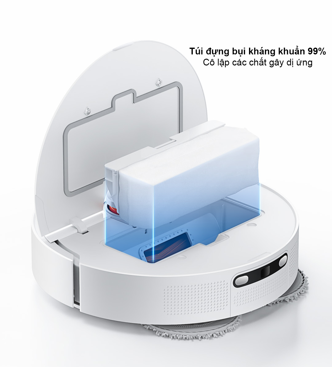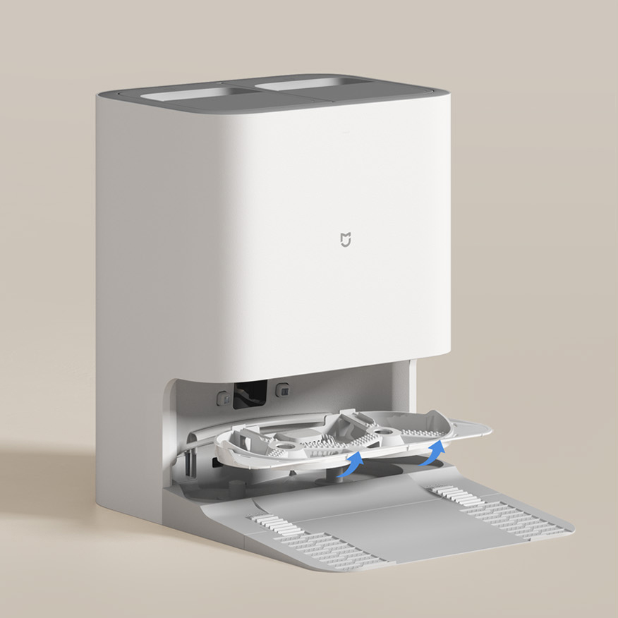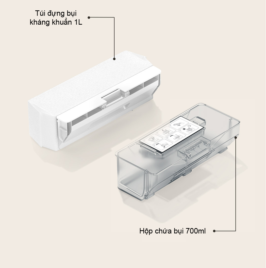 Dock sạc của Mijia H40 không chỉ giúp sạc pin mà còn tự động gom bụi và giặt sấy khăn lau. Hộp bụi 1L được trang bị túi chống khuẩn, ngăn chặn sự phát triển của vi khuẩn, bảo vệ sức khỏe gia đình. Ngoài ra, dung tích bình chứa nước 4L cho phép robot làm sạch không gian lớn đến 500m² chỉ với một lần đổ đầy.