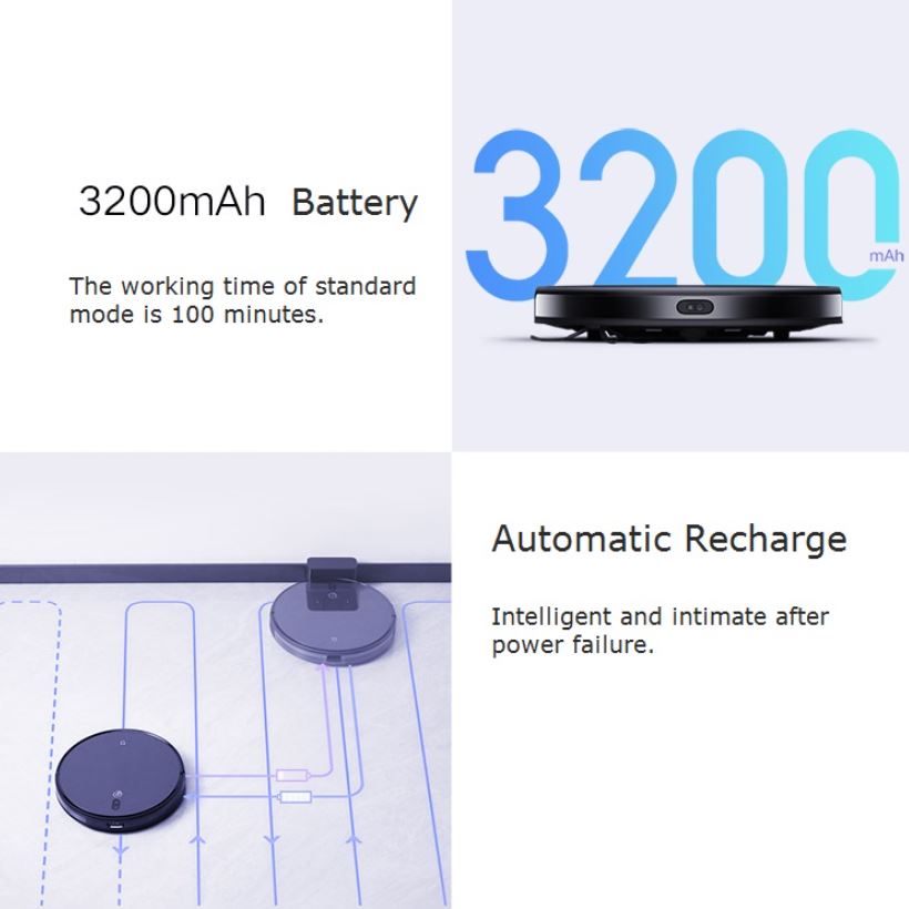 Pin dung lượng 3200mAh, nó có thể làm việc liên tục trong 100 Phút. Hỗ trợ tự động quay trở lại đế sạc.