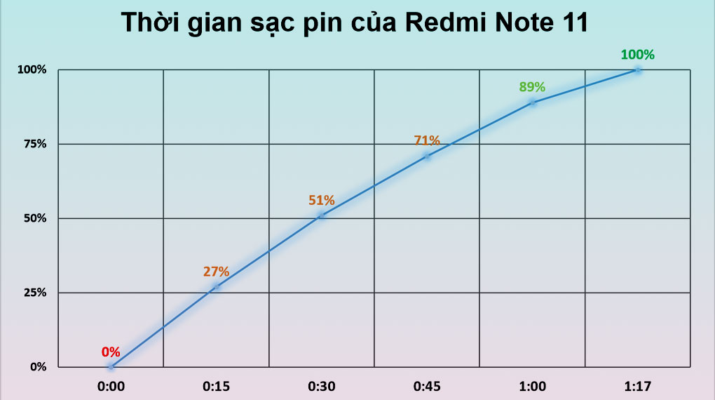 Cùng với viên pin lớn thì Redmi Note 11 cũng được trang bị công nghệ sạc nhanh 33 W Pro tiên tiến và an toàn, mình có sạc từ 0-100% pin thì máy chỉ cần khoảng 77 phút.*