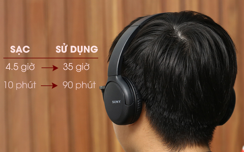 Tai nghe Sony WH-CH510/BC Bluetooth : Có thời gian sử dụng pin lên đến 35 giờ, cho bạn thoải mái nghe nhạc. Nếu tai nghe sắp hết pin, chỉ cần sạc nhanh trong 10 phút là bạn có thể nghe nhạc thêm tới 90 phút.